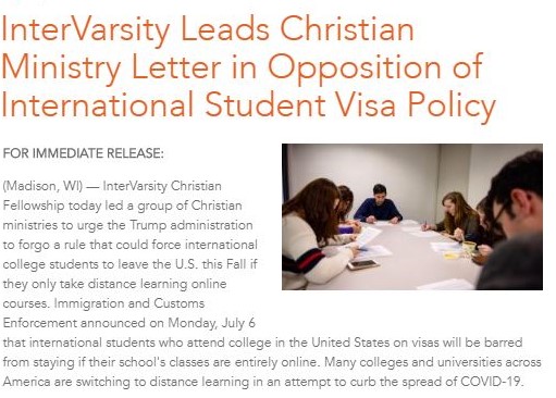 Graduate Faculty Ministries and ISM (International Student Ministries) are two field ministry groups that will significantly feel the impact of this. I would greatly appreciate you taking five minutes to read a Letter of Response from InterVarsity’s national leadership to the Department of Homeland Security. Its well done, offered in a spirit of respectful protest to the proposed policy change.