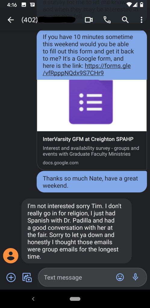 Vapid expectations crept through my efforts to restart “the group” this August. No Student Activity Fair hosted by Creighton. No new student contacts to speak of. Just an aging list of last year’s contacts. Three students indicated that they would not be returning to the group, but were starting a group of their own with pharmacy colleagues. (That’s actually terrific – they have a national organization they can connect with that is just focused on Pharmacy). I got the text seen above from No-Religion-Nate (hope you have a nice life, Nate, not sure why you signed up last year in the first place). I heard back from Lela – a student who attended GFM once her first year, but withdrew from the OTD program last fall. Crickets from 14 others after three attempts.