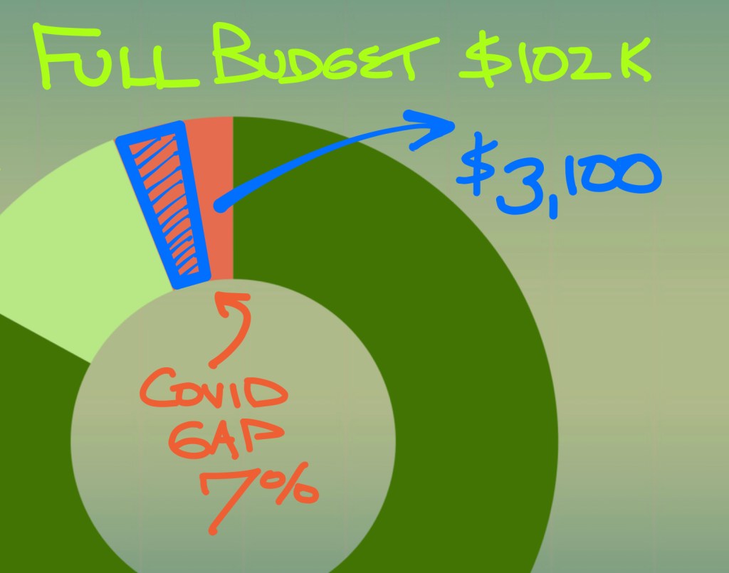 As I’ve been hinting, Covid has taken a bite out of what already is a faith-stretching challenge. Every year the basic goal in my case is to find enough giving units to cover a $102K budget and add on top of that the resources I need for developing new ministry in my territory. Without Covid, I started 2020 with no deficit and with a need to find about $12K in new support. With Covid, I’ve needed to find an additional $7-8K.
