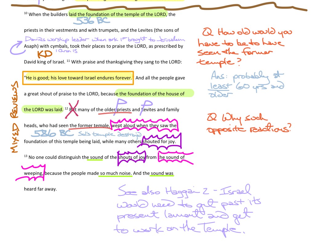 Do you know how to mark-up a manuscript? In my last post you’ll find a link for downloading your own clean copy of Ezra chapter 3. In this post I’ll show you mine, which is marked up all over (I mark things up electronically using the Noteability app). I’ve broken the chapter into three paragraphs and titled those sections. Ezra 3 is packed with references to the Jewish worship calendar and the daily priestly duties at the altar (see the background information for helpful details). Bear in mind that in 536 B.C. there was no temple. Only the footprint. It would be a little like showing up at your church on Sunday, but with no walls, no atrium and no fellowship hall. Just the foundations shorn to the ground. No roof, no pews (or padded designer theatre seats) no sound system, lights or smoke machines! Just a small scrap of platform where the stage used to be and maybe a charred table where the communion elements might have sat. Joshua restarts everything by remaking only the altar and restarting their worship calendar!