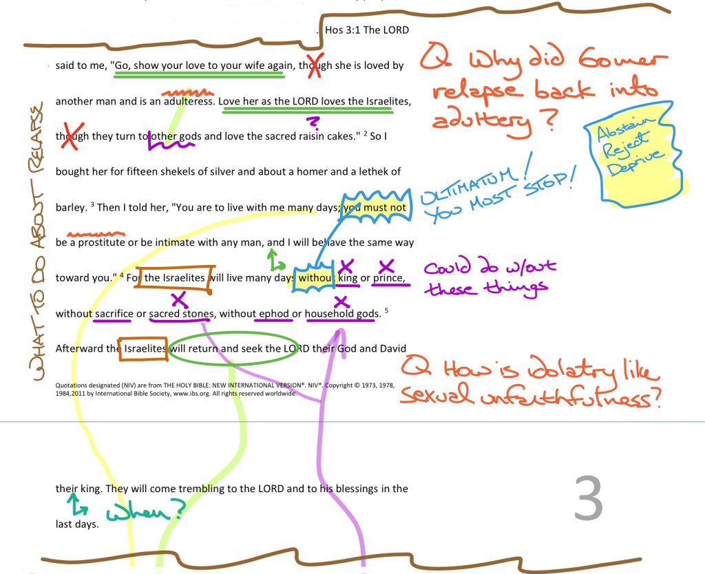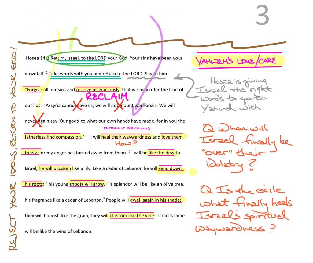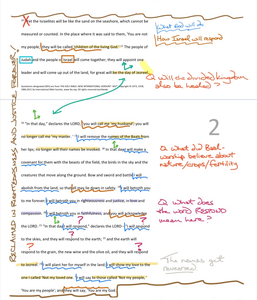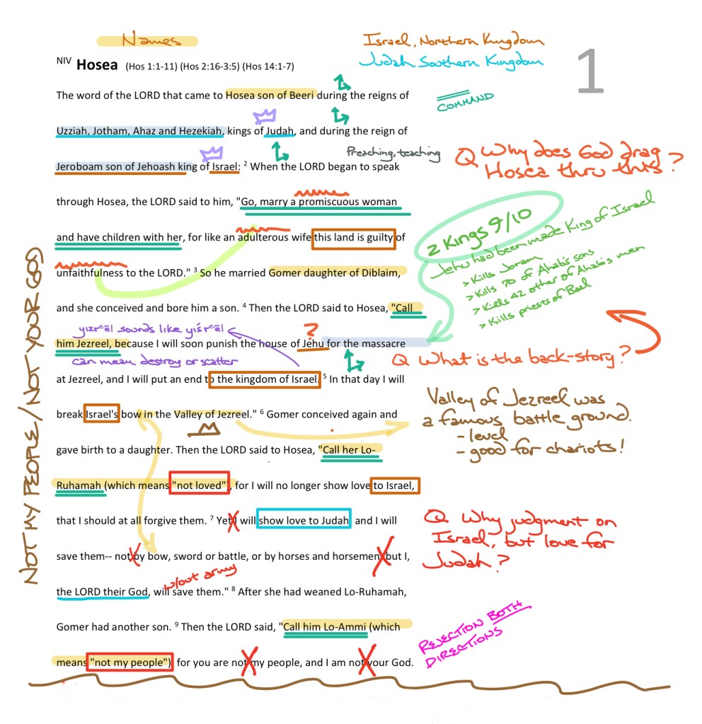 My scrawlings below will ruin it for you purists. We’re going to attempt to get a feel for the entire book of Hosea by looking at the beginning and the ending. At the top of the manuscript you’ll see the three selections we’ve chosen. As you scroll down below, you’ll find a series of inductive questions. I wrote about why I picked this moment to consider in the previous blog.