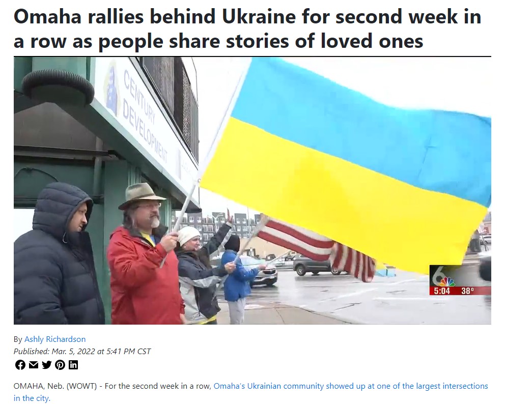 If you’re looking for ways to support Ukraine, here are a couple of recommendations. Pray. And see if you can connect with Ukrainians in your vicinity. Just yesterday Cheryl attended two outdoor gatherings of support hosted by local Ukrainians. In fact each Saturday at 1:00pm, people have been collecting at 72nd and Dodge.