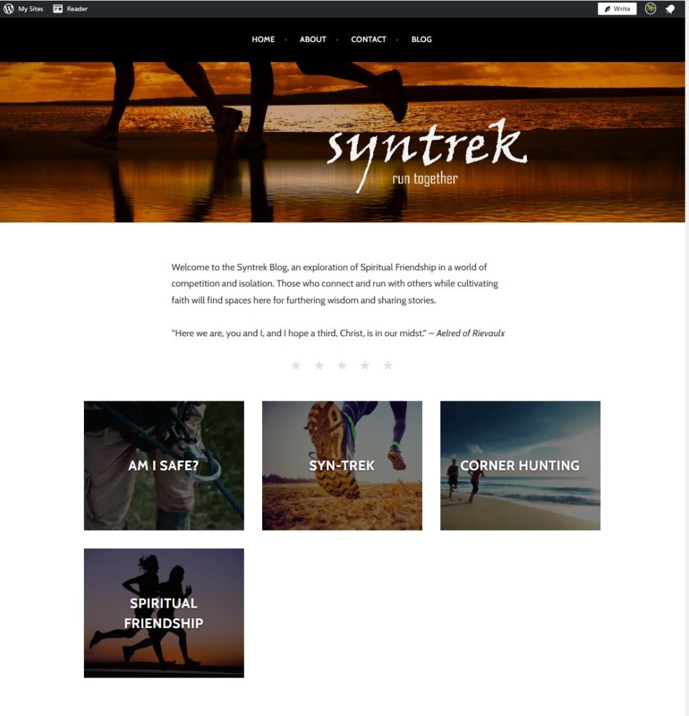 Syntrek is a new strategy for one on one discipleship that explores the benefits of Spiritual Friendship. This fall I’ve intentionally networked all my contacts into pairs of students who are exploring themes of soul-care. If you have a minute, hop on the link and check out the blog. Its definitely under-construction at the moment, but we’re building the home-page around a series of 9 foundations. Blog posts will follow. I’m especially excited about the most recent article a member of my team wrote, Am I Safe? My dream is that over time we’ll grow a list of contributors and flesh out the web-site with tools and stories. If you find it helpful, feel free to subscribe. I’m currently using it with students by sending them a link when a new story is posted.