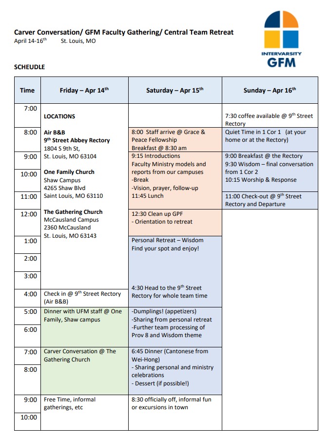 So, what was I doing in St. Louis when I lost my ’04 Accord and broke my sternum? Fighting a 3-headed monster, of course! For some weeks my team and I had been concocting a three-phase weekend event for the purposes of collaborating with The Carver Project, hosting a GFM Faculty Gathering and enjoying a 24 hour staff team retreat! I’ll take these in opposite order in the next couple of blog posts. The overall monstrosity involved teaming up with the undergrad Central Region to invite all the Christian faculty members connected to our ministries to St. Louis for The Spring Carver Conversation.