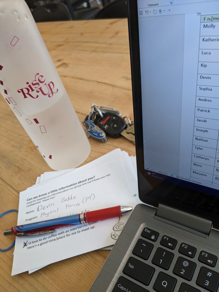 I would absolutely love it if you would combine your twin superpowers of pic-pinching and praying. If you don’t know what pic-pinching is, I guarantee you’ve done it a hundred times today by the time you read this post (instructions are at the top). You know what to do. Pinch this pic till you can see all 15 names on those follow-up cards. They’re in the first column of the table you can see on my computer screen. That’s not just a stack of cards sitting on my table at Zen. That’s not just an NSO follow-up spreadsheet. Those are fifteen graduate students I’d love you to pray for by name sometime this weekend. Fifteen grad students well-known by God and their loved ones.