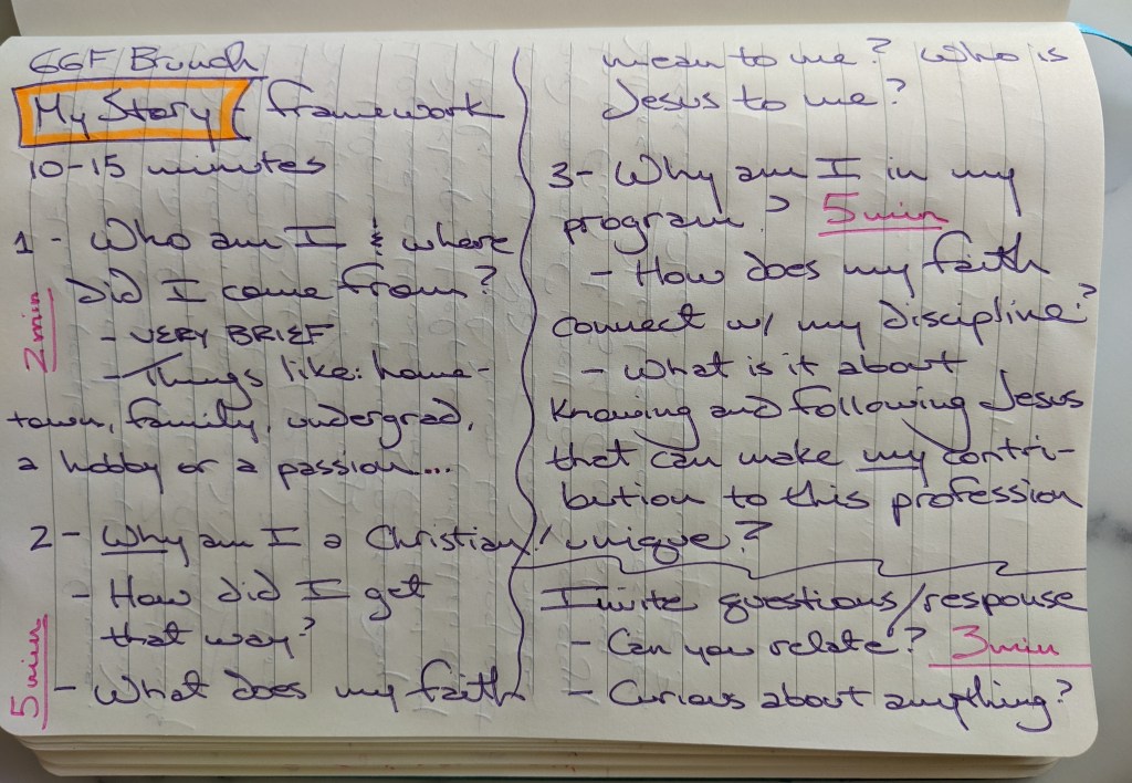 Getting students to give this kind of talk does several things. 1- It helps them identify as Jesus following Christians in their academic and professional context (no small feat). 2- Telling their Christian peers their story first paves the way for telling non-Christian classmates and professors about themselves including the parts where their faith connects with who they are and what they care about.