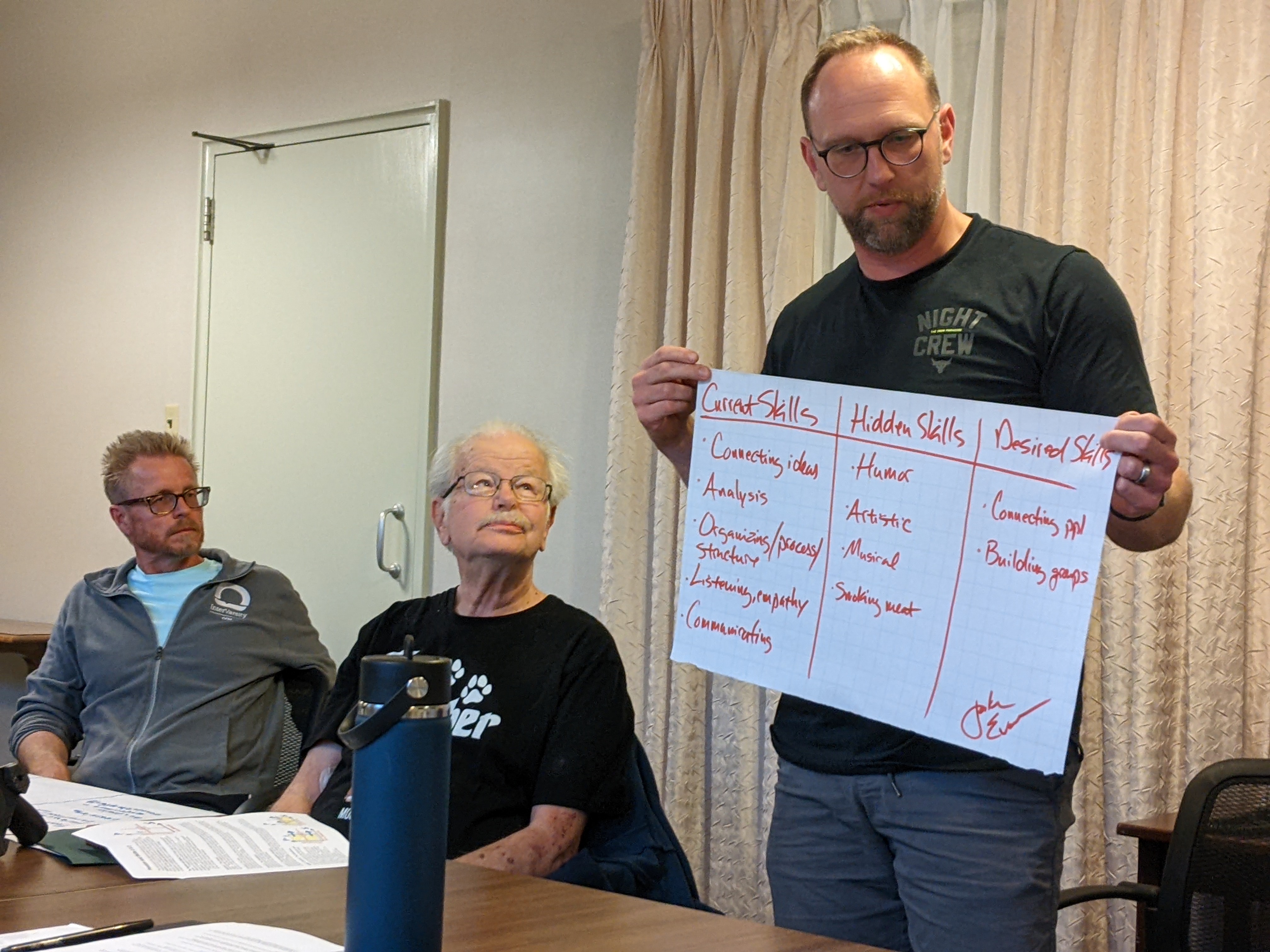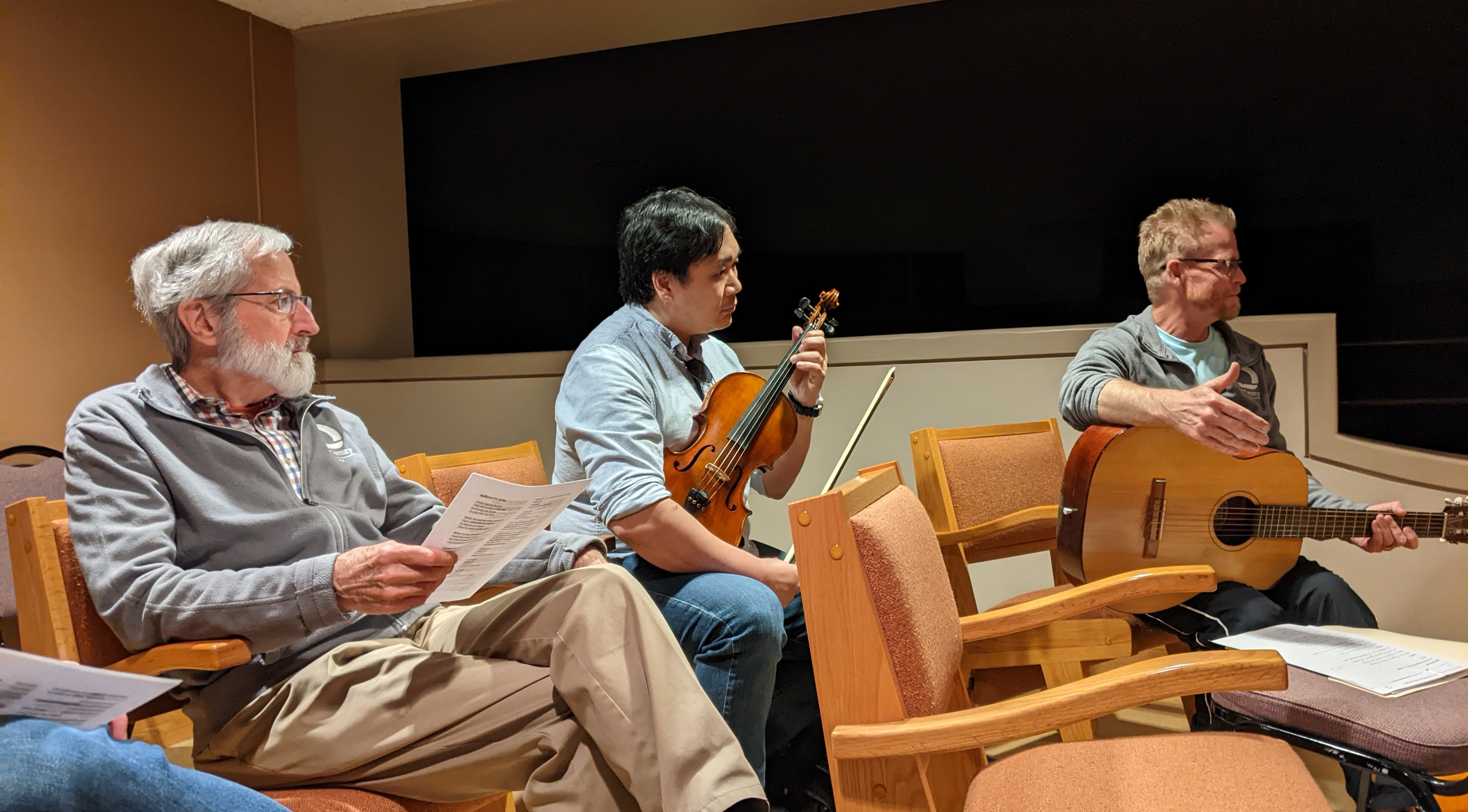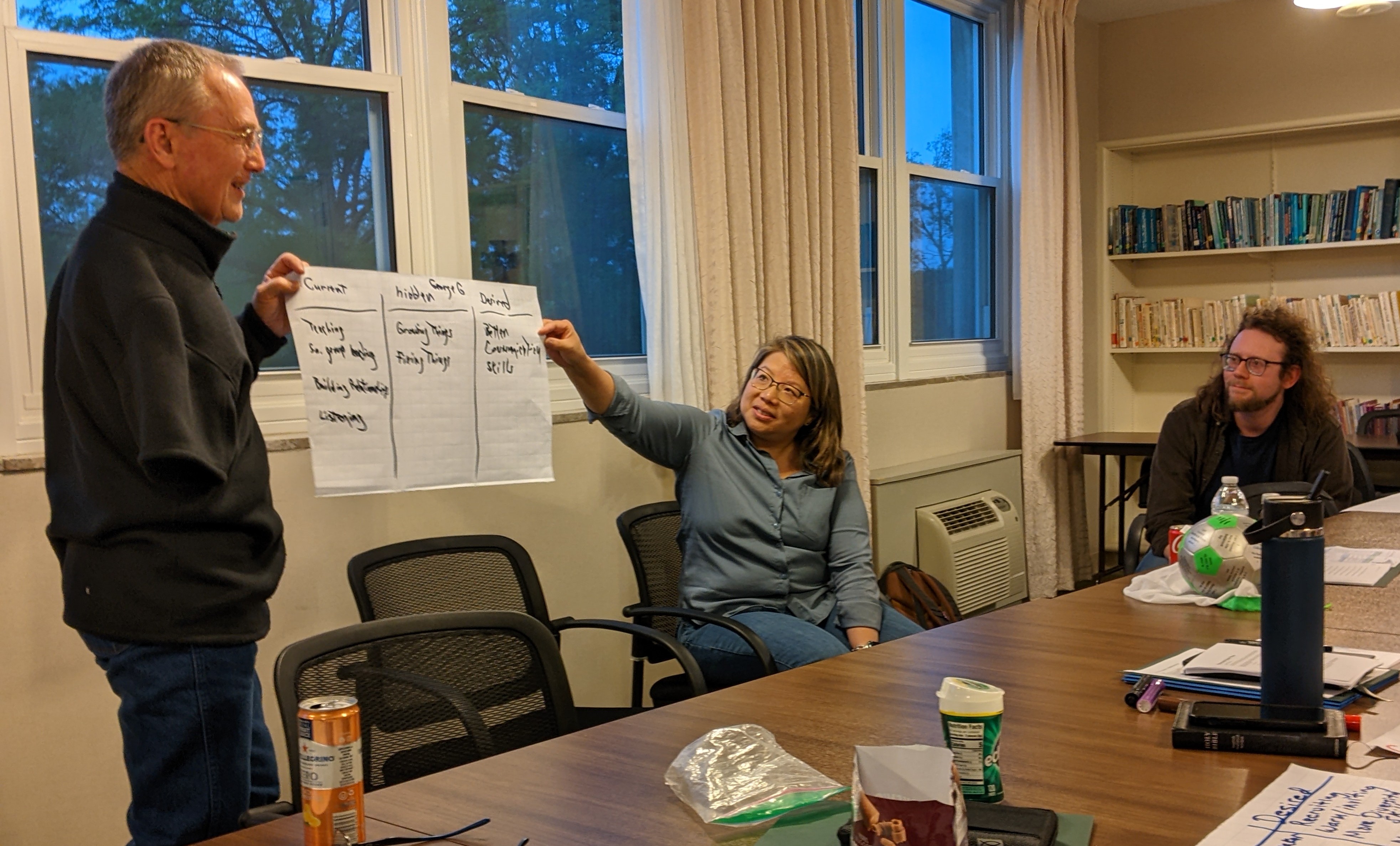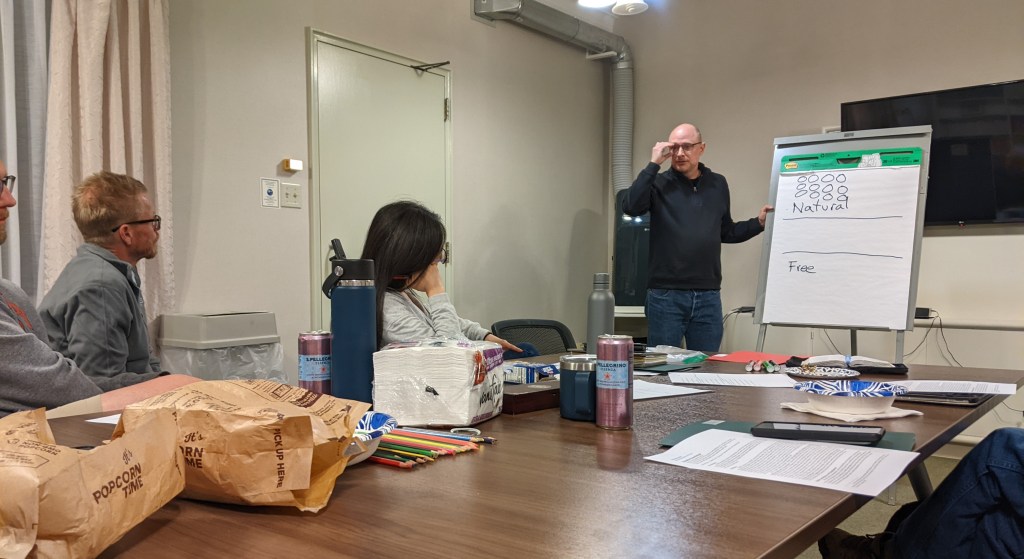 So Saturday night we popped bags of Orville Redenbacher, had Mark show us a Star Trek episode and take us through one of the chapters of his book. IF you are super curious about things Trek-worldly, we watched Children of the Comet, season 1, epsode 2 of Strange New Worlds and we talked about predestination and free will! In fact the whole weekend was designed to have our team bring their best gifts and lead something. Tom and Chad (with Josh on viola) lead prayer and worship times modeled after their weekly faculty/student prayer gatherings at Iowa State. Ben and Jake led us in scripture around our theme: Growing Grapes and Tending Vineyards (John 15 and Mark 12). George brought us Wash-U faculty member John Hendrix as a Saturday afternoon guest. We enjoyed hearing his story, talking about his vision for faculty ministry and asking him questions.