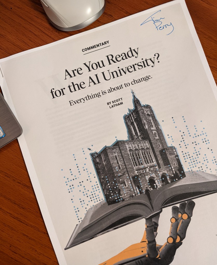 That’s a little extreme, Tim. Maybe you’re getting ahead of yourself? Toward the end, the article did deliver on its hook – what an actual artificially intelligent university might look like. But well before we get to something that far out, the presence and impact of A.I. on university education IS being felt pervasively. Even if I see few changes in my my four-state area, I’m very convinced changes are well underway at a swift pace. When you read the article these are the kind of lines jumping out from the shadows as you read:pit