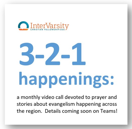 - I’ll be hosting a new Regional Staff Team video call we’re branding 3-2-1 Happenings. Monthly we’ll try to round up staff to share stories about outreach happening on our campuses. Pray for us to get off to a strong start next week!