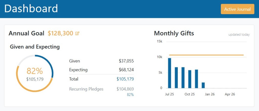 Donor Elf reminds me what my annual target is – by the end of June (our fiscal year) I need to raise $128K to cover my entire budget. That includes my salary. My health insurance. The amount I’m setting aside for retirement. All my ministry expenses including travel. And my training and conferences.
