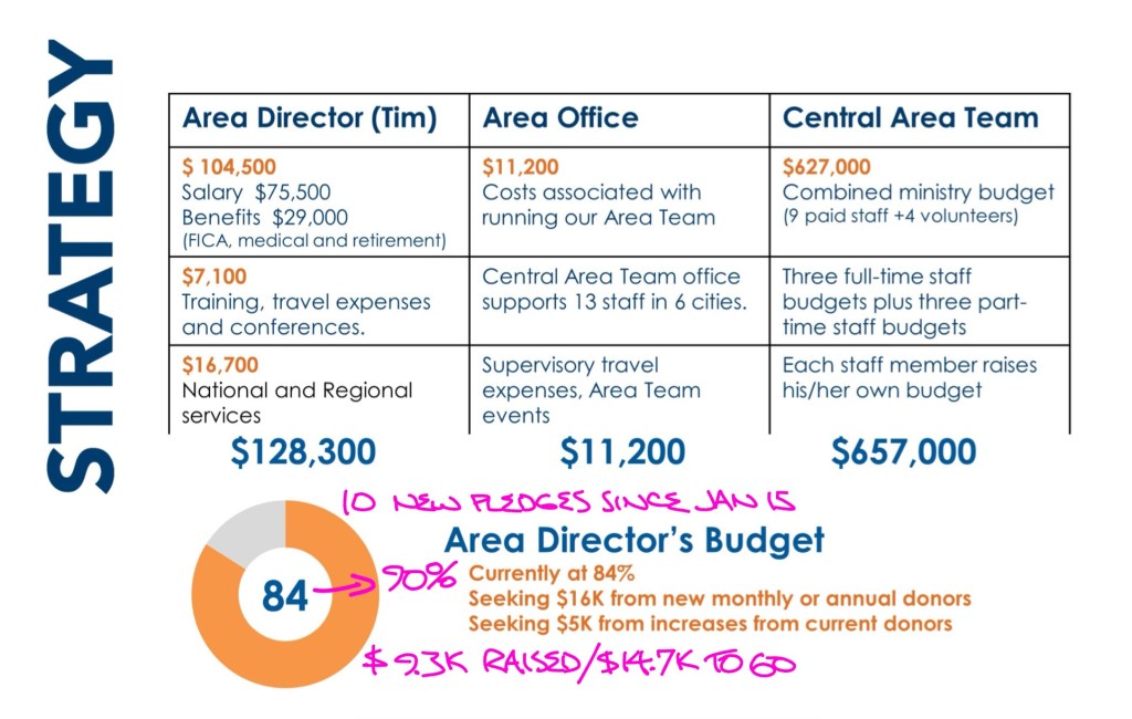 What I’ve been chatting about in this post so far is just my budget ($128K). When you look at the rest of my team and my Area expenses, the total funding picture is over $600K annually. As we enter the fourth quarter of our fiscal year, we’re pushing and praying and hoping for our entire budgets to come in. Our paid staff and even some of the volunteers take responsibility for their own budgets. They each have a team of ministry partners giving to their salary, benefits and ministry expenses. We’re so grateful for the hundreds of people who keep our Area funded and prayed for each month!